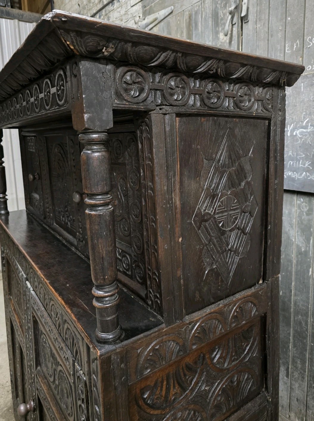 This impressive cabinet is crafted from solid oak, likely dating to the 17th century. The cabinet features intricate carvings across the panels and door, depicting floral and foliate motifs. The cabinet’s construction suggests it was originally a livery cabinet, designed to display valuable items or serve as storage within a grand home. The cabinet’s robust construction and detailed carving exemplify the craftsmanship of the period.