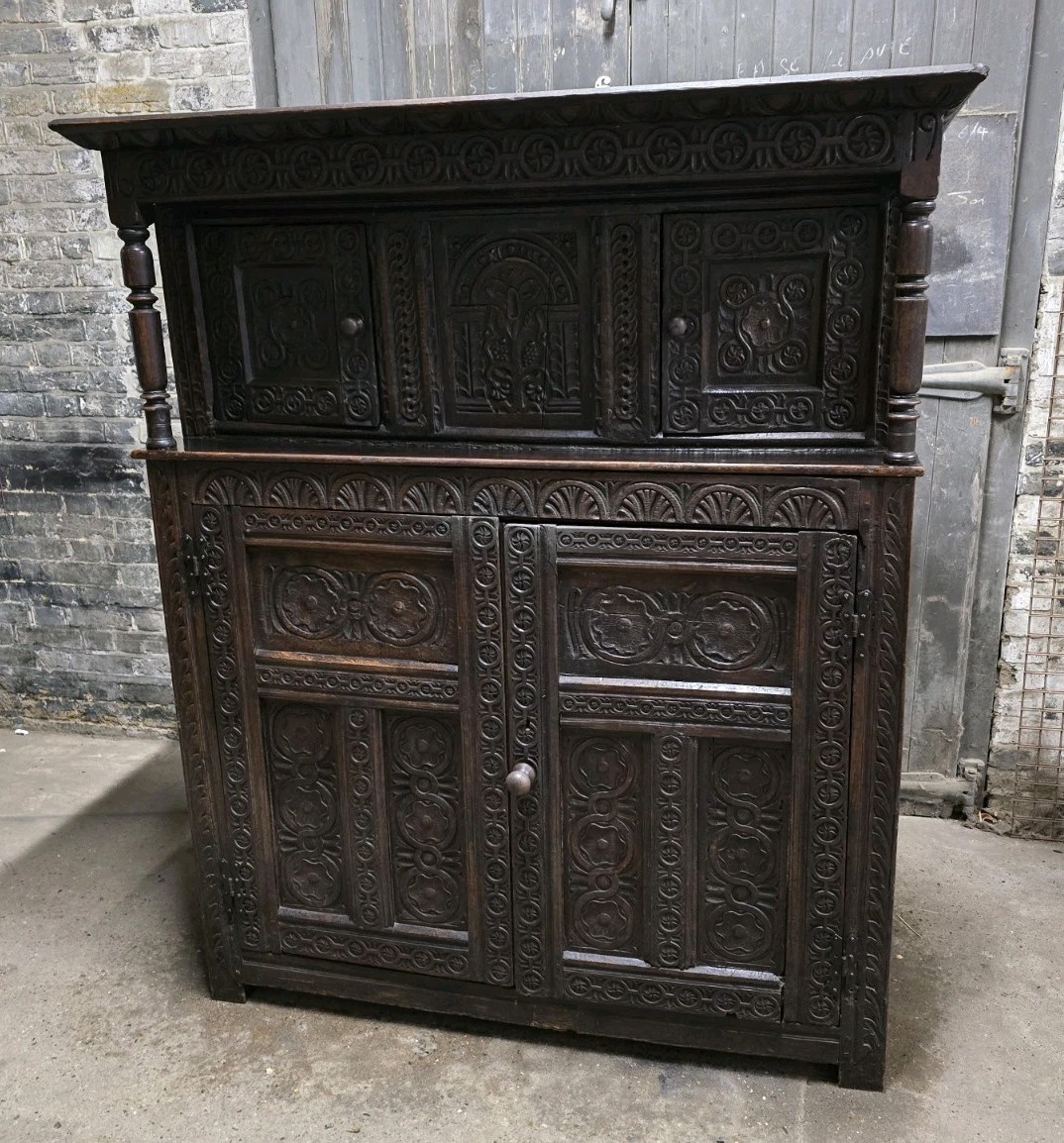 This impressive wardrobe is crafted from solid oak, featuring intricate carvings across the panels and a substantial moulded cornice. The wardrobe’s design suggests a Victorian or late 19th-century origin, with a focus on decorative detail and robust construction. The interior offers hanging space and shelving, indicating its original function as a storage piece for clothing and personal items.