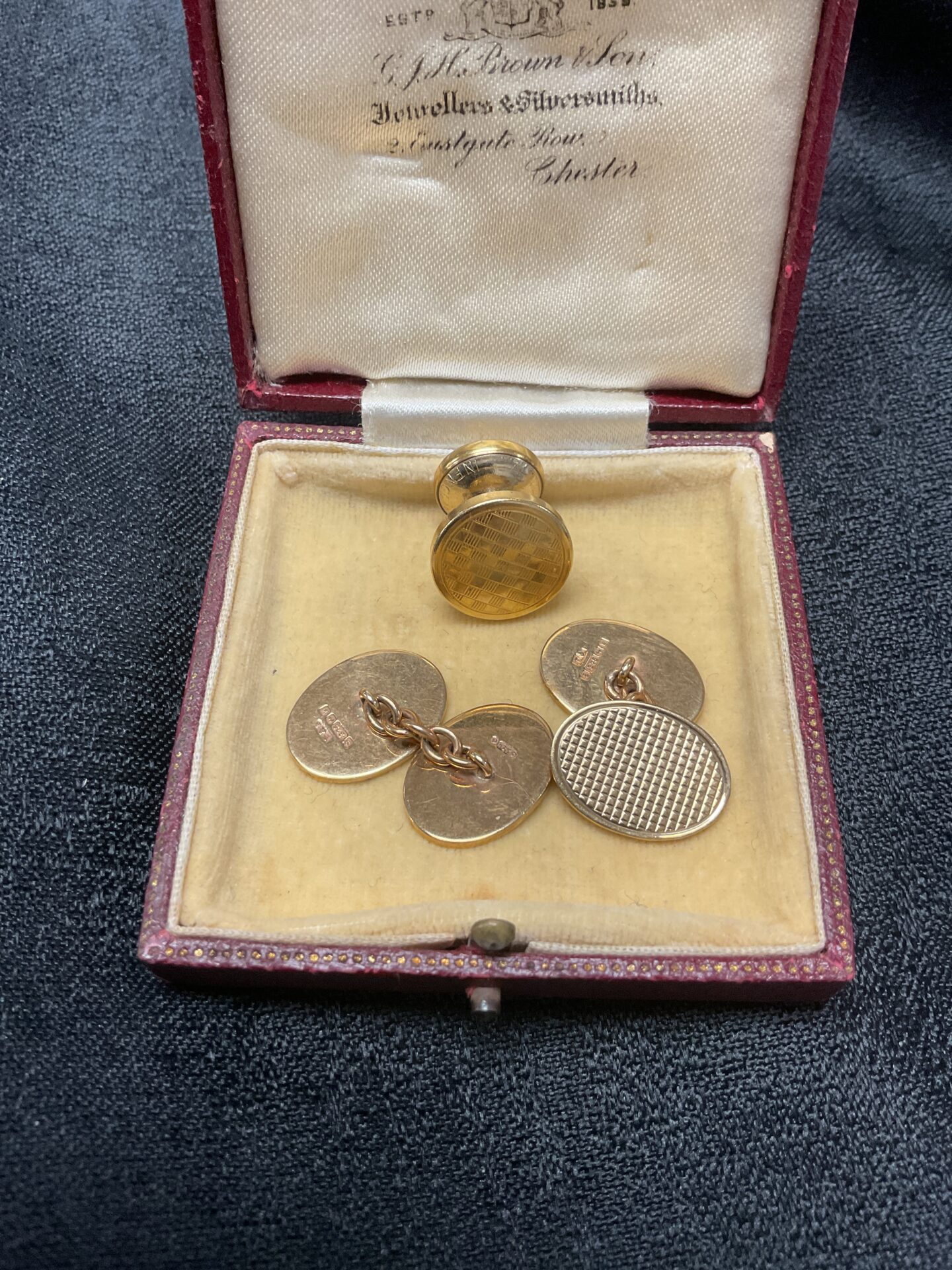 These antique gold filled cufflinks feature intricate engraved detailing and a classic Victorian design. Presented in a velvet lined presentation box, they offer a glimpse into a bygone era of men’s fashion. A unique addition for collectors or those seeking a vintage accessory.